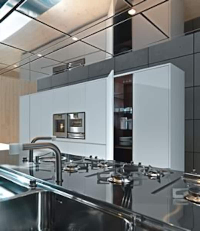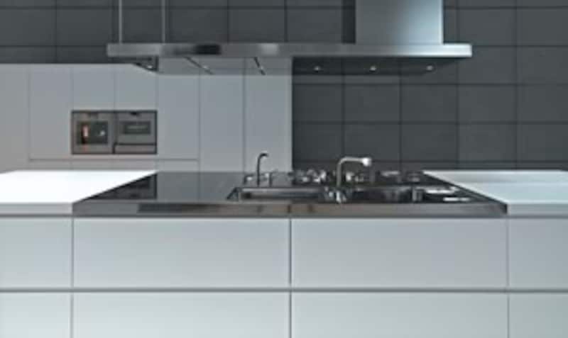 シンプル&スタイリッシュがウリのACHEOは,ダブルシンク-作業台-6連ガスクッカーの3要素を2400wide×1200depthの鏡面ステンレスでまとめ,他のキャビネットは真っ白なキャンバスのように自由に構成する。