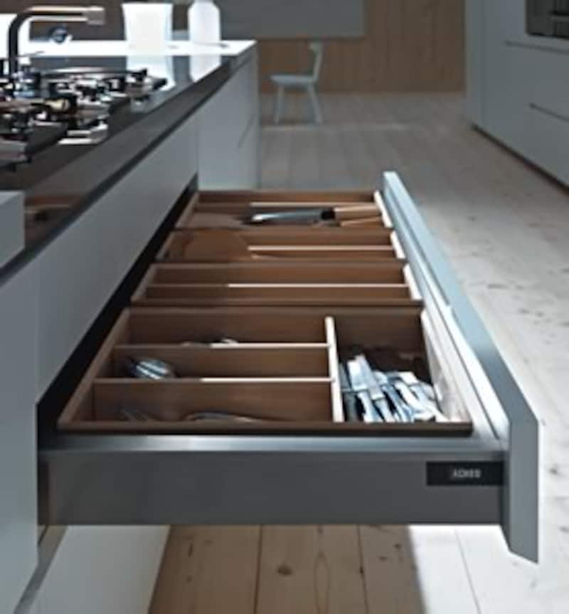 ガスクッカー下の木製カトラリートレーを組込んだ1200巾の大型引出し。