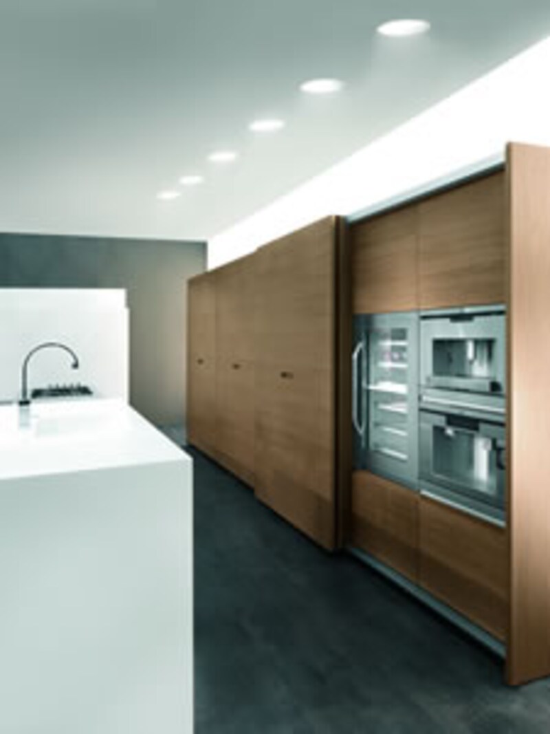 ウォールユニットには、食品庫、冷凍冷蔵庫、ワインセラー、ダブルオーブンがビルトインされている。日本ではこのように組込んだオーブンを扉で覆うことは、消防法で禁じられている。