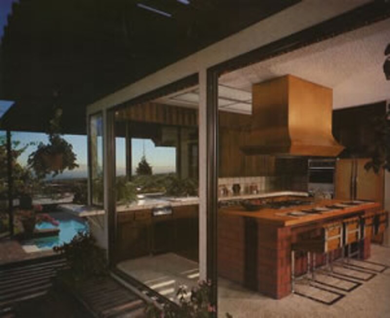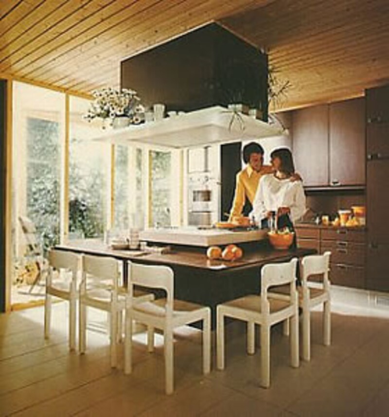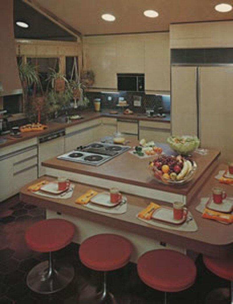 ◆1978年アメリカのアイランドキッチン。非常に開放的なこのキッチンはアイランド部分にクッカーとダイネットカウンターを配置し、シンクは採光充分な窓側にレイアウト。銅板を叩き仕上げしたブーツ型のレンジフードが当時の人気で、アイランドキッチンのシンボルともなりました。