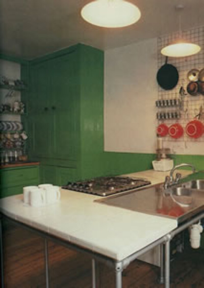 ◆ミニマルデザインが話題を集めた1982年、イングランドで発表されたシンプルキッチン。白いカウンターはタイル仕上げ。シンクとガスクッカーを向かい合わせに配置した例。ふたりで向かい合って使うのには適していますが,一人で作業するにはいちいちひと回りしないと連続作業ができません。