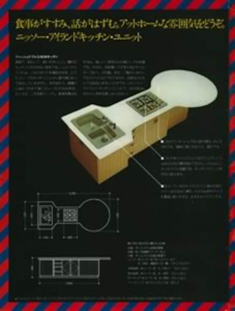 この少しあと1975年頃から日本のシステムキッチンが黎明期を迎えたエポックデザインとなるアイランドキッチンです。