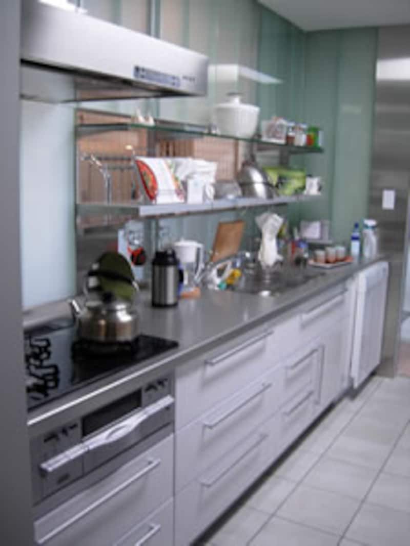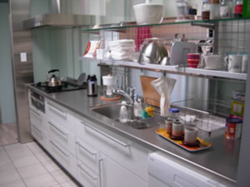 ガラス壁を生かすために,壁面の収納は吊り戸棚をやめて,オープンなガラス棚とアルミ棚にして、とても使いやすそうだ。