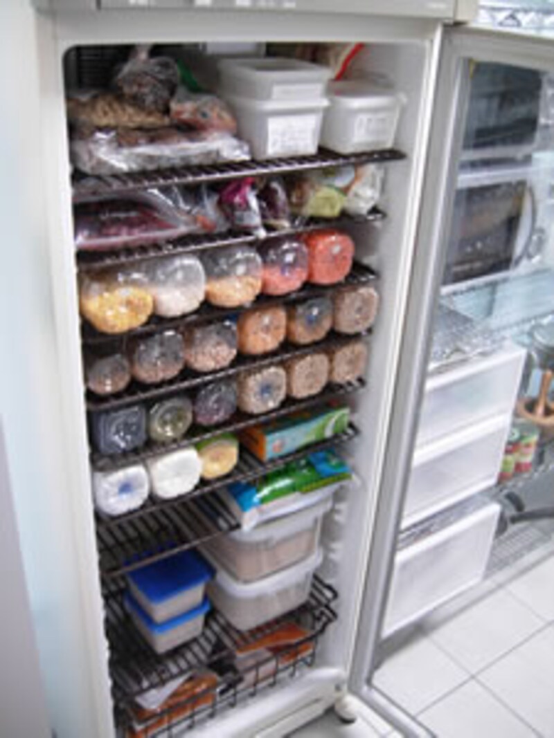 ワインセラーの中はワインの収納ではなく,20本のペットボトルに分類された豆類、ホールスパイス,乾燥食品などのストックが整然と収納されている。
