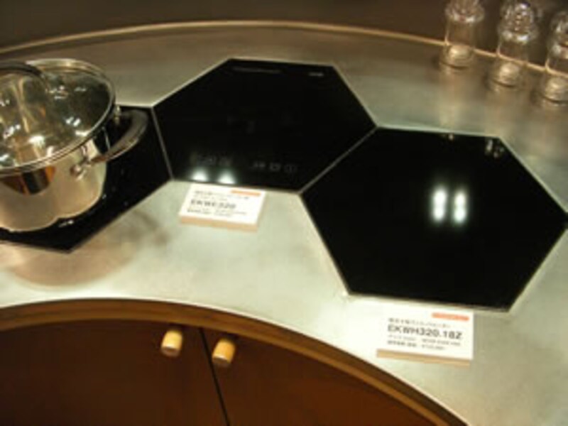 6角形のユニークなラジェントヒーターを組み合わせて構成するハニカムクッカーが面白い。但しラジェントヒーターのみでIHはまだない。
