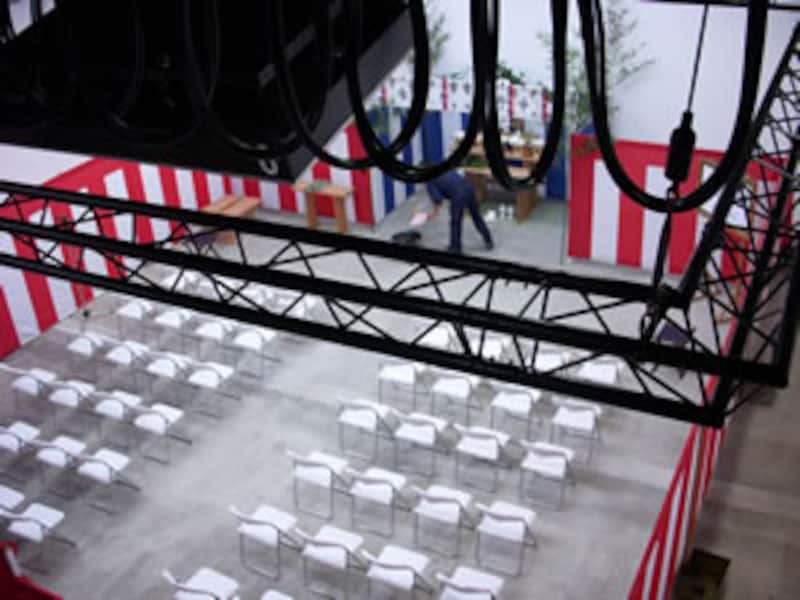 6m以上の天井高のこのスタジオは上階の制作室まで吹き抜けになっている。