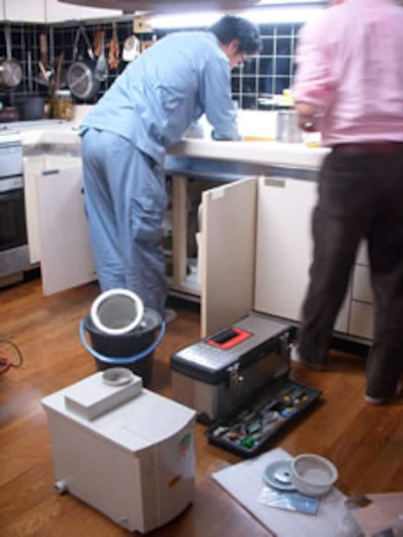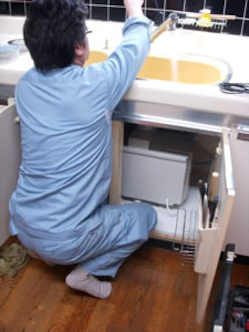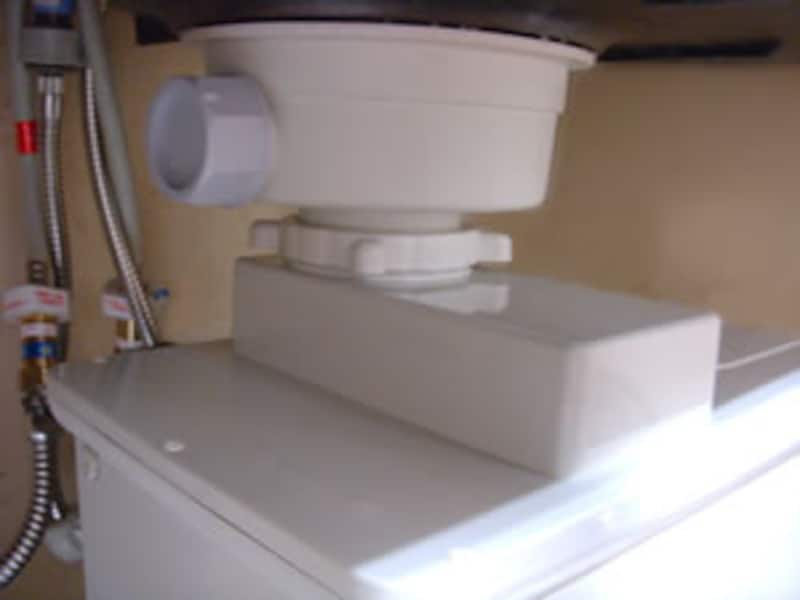 シンク下に設置した状態。左に見える袋ナットはダブルシンクの場合の接続口となる。