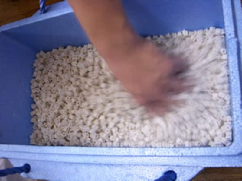 取り付け工事に並行して、シンクピアの心臓部ともいえる「バイオスター」と呼ぶ、微細な穴の空いたカプセルの中に、生ゴミを分解する「シンク・ザイムSP-100」の液状バイオ菌を定着させる作業をおこなう。発泡樹脂のトロ箱の中にバイオスターとシンクザイムSP-100と水を加えて、よく撹拌しておく。