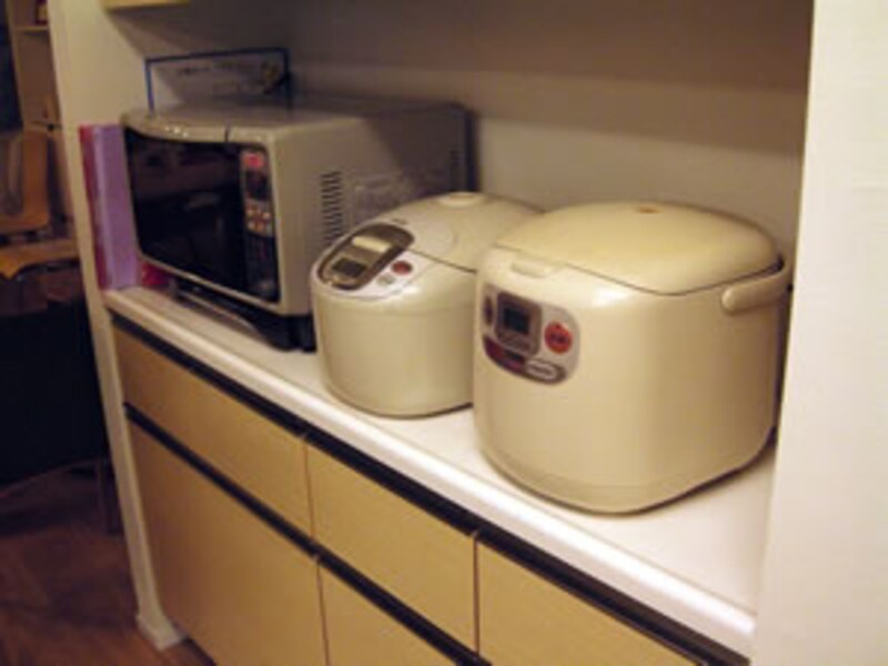 オーブンレンジと2台の炊飯ジャーが並ぶ。