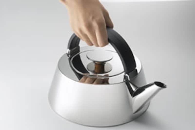 今までのケトルデザインの概念を打ち破る全く新しいケトルが登場しました。SUS304ステンレスの材質を極めた本磨き仕上げの質感と、細部にわたるディテール処理の完璧さとが相乗効果でこのケトルの評価を高めています。安定感のあるフォルムが使い易さにもつながり、ふたのツマミ部分に使われた天然木が熱伝導を抑え、細部への心配りが感じられます。