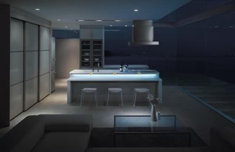 透明な質感は、一日の生活シーンの中でその表情を変え、暮らしの楽しみや喜びを演出してくれます。朝日を浴びて光り輝くキッチンが、夜になるとバーカウンターに内蔵されたLEDライトでホームバーの雰囲気を醸し出してくれます。