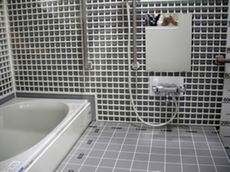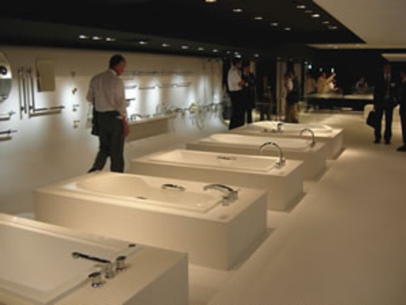 川本社長みずから先頭に立って、商品説明や質問に丁寧に答える姿勢には、非常に好感が持てる。特に上の写真のバスタブの納まっている三面モザイクタイル張りのデッキは、従来なら役物タイルを使って仕上げるところだが、ここではナント!ブロック型のモザイクタイルを使っている。従来のタイル張りの概念を打ち破る手法は、現物を前にして説明を受けると感動ものだ!