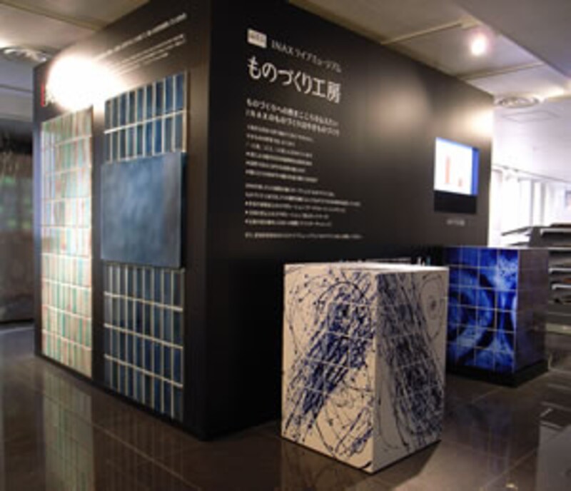 焼き物の原点を知ることができる「ものづくり工房」の展示も面白い。光や影を効果的に生かす手法は新しいイマジネーションをかき立ててくれる。下のタイルは光透過型の白磁タイル。