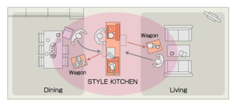 スタイルキッチンをリビング・ダイニングにレイアウトすると、エンタテイメントキッチンの要素が生まれ、家族の中心にあるキッチンプランが可能となります。