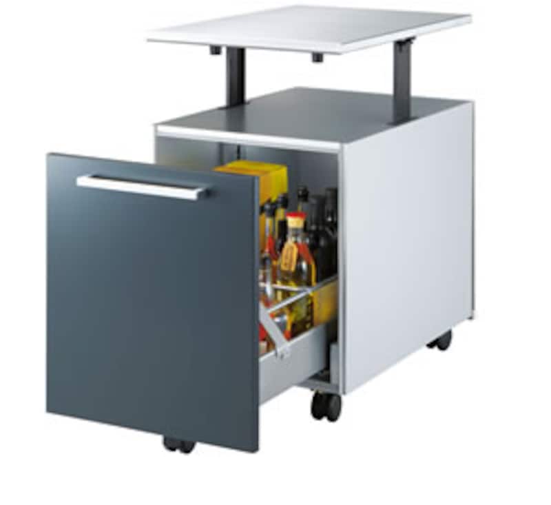 ゲート型スタイルキッチンの補助作業台ともなる収納ワゴンには昇降式のテーブルタイプも用意されています。