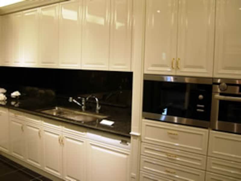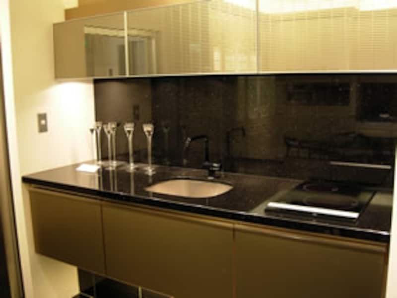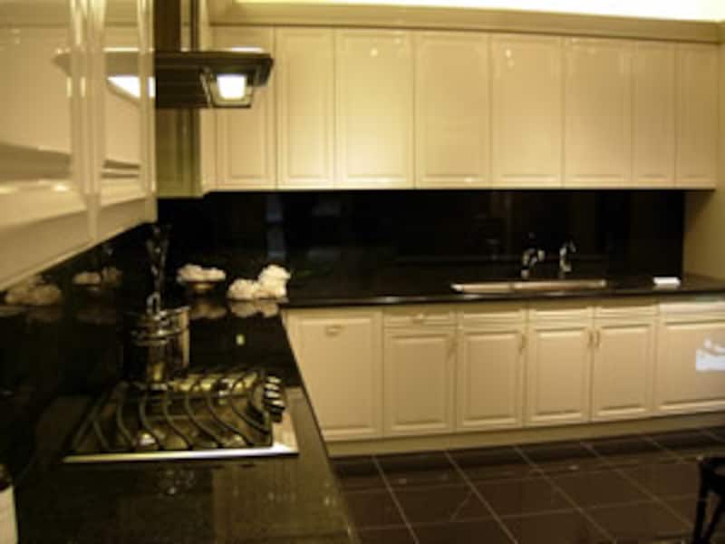 エクセレントL型レイアウトのキッチン。扉はエンブレム。トップは天然石 エメラルドブラック。