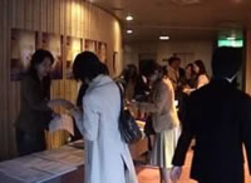 | ◇渋谷駅から丸井方面への道を歩いて正面ドームのあるビルが東京電力館。8階に講演会会場のTEPCOホールがある。 | ◇TEPCOホール当日の受付風景。 |