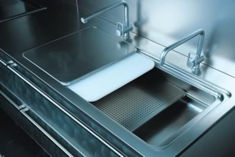 立体3層構造の3Dシンクは洗い、切り、下ごしらえ、水切り、茹でこぼし、料理の盛付け等の一連のキッチン作業が横移動なく同時進行ができるマルチ機能シンクで、ゼロ動線はこの3Dシンクから生まれる。