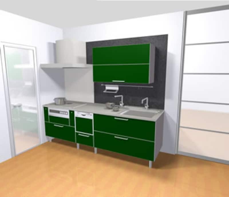 オンウォール(壁付け)プラン1.5間間口(2550mm幅)750幅IHクッキングヒーター、ステンレスレンジフード、引出し式食器洗い機等のビルトイン機器を含んだセット価格は\888,000(税込\932,400)。