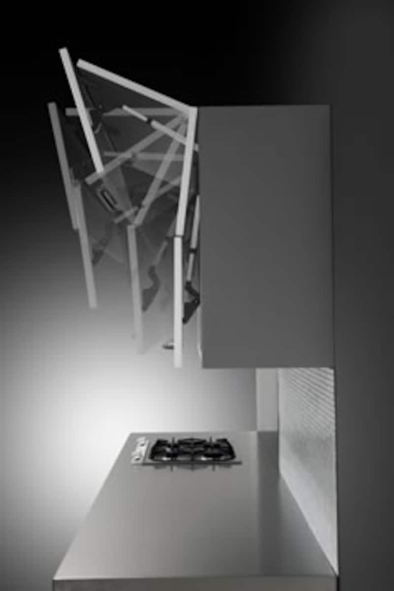 ウォールユニットのウィングチップ扉は、好みの位置で固定されるので使い勝手が向上する。ウィングチップのムービー画像はトーヨーキッチンのWeb TPSから見ることができる。