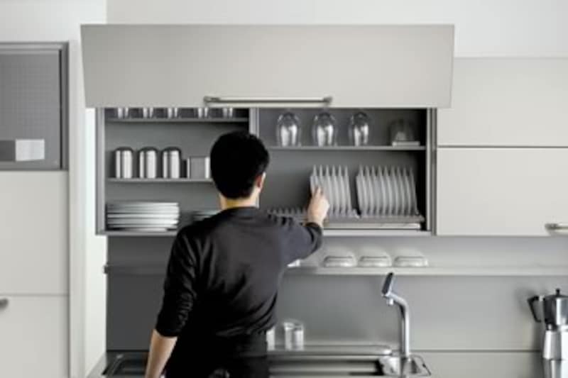 平面的なゼロ動線と合わせて、立面でのゼロ動線を実現するために1200mm間口の大型ウォールユニット「ウィングチップ」は、取り出し易いアイレベルの高さまでウォールユニットを下げて効率的にキッチン作業ができる配慮がされている。