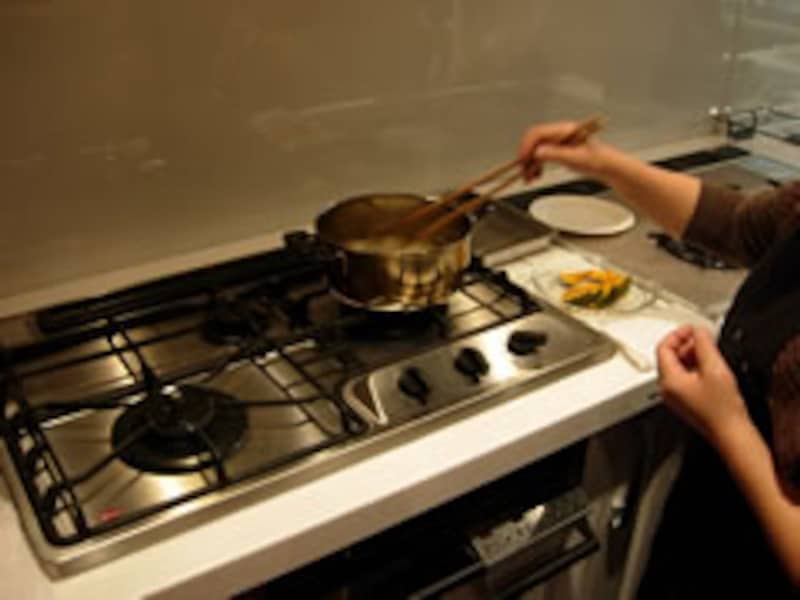 天ぷらなどの揚げ物は、センサーで鍋底の温度を感知をしてバーナーの炎を自動的に強弱させて温度コントロールがおこなわれる。実際に使ってみるとデリケートに炎が調整されて違和感なく揚げ物ができる。