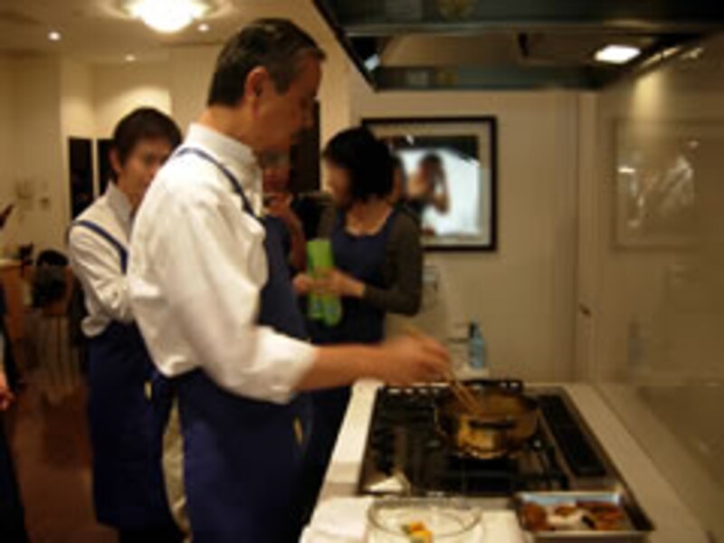 キッチンメーカーのデザイナー達が横断的につながりを持ってスキルアップをしたいという熱意から昨年スタートした「キッチンデザイナークロスミーティング委員会」と、リビングデザインセンターOZONE開館時の13年前に「これからの日本のキッチン空間を考える研究会」としてスタートし、その後「NPO HOTNETキッチンを考える会」として活動を続けているグループとのコラボレーションで、「ピピッとコンロ+do」の調理体験会を東京ガスのご好意で開催しました。集まったメンバーは15名で、まずピピッとコンロ+doの商品開発コンセプトや特徴についてレクチャーを受けました。