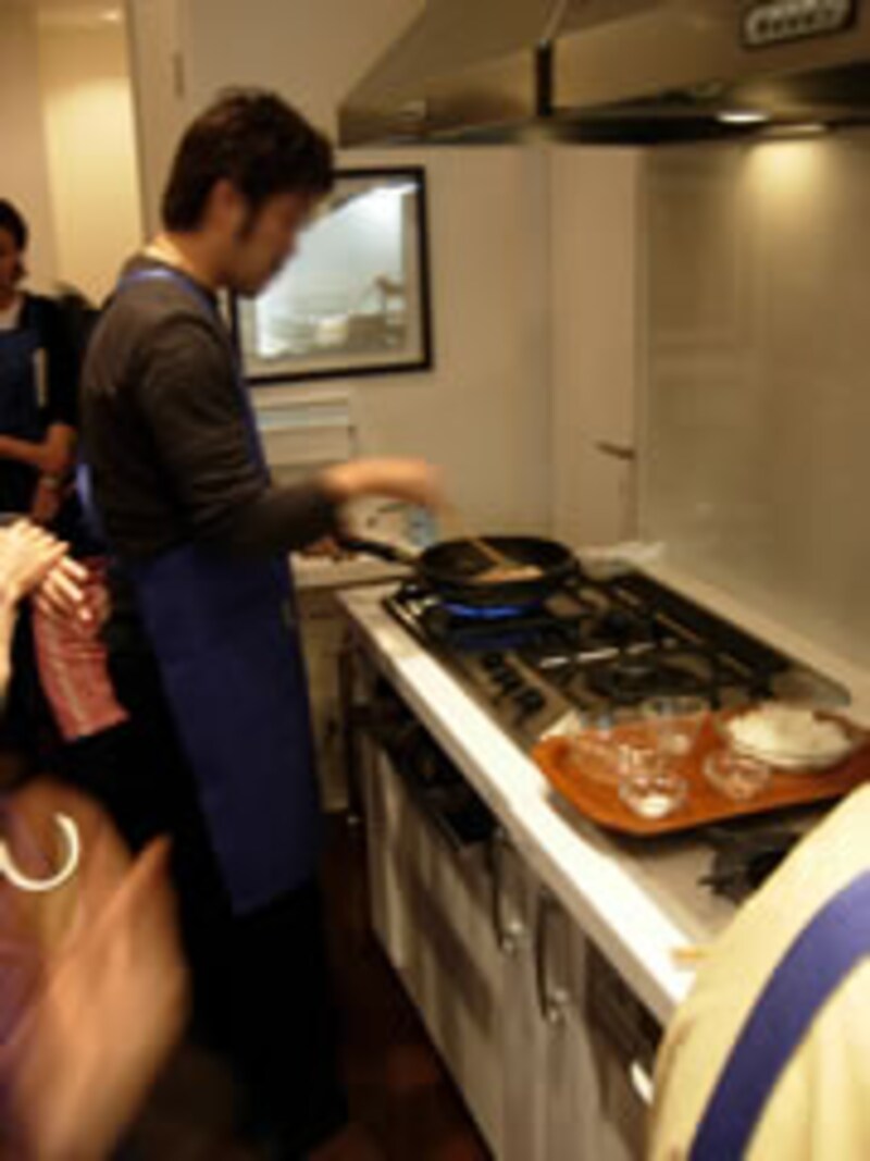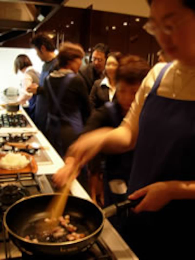 男性メンバーもこの会ではキッチンに立つことが基本です。手さばき鮮やかな彼は自宅キッチンでは業務用コンロの1万Kcalバーナーを使いこなしているため、4500Kcalバーナーでは一寸物足りないと言う。一般家庭のキッチンの安全性を考えるならばやはり4500kcalは上限だと思う。普段IHを使っている私は、強火の炎が鍋にまわって北京鍋の把手が熱くなるのが気になった。ガス屋いわく”これが料理の真髄なのです!”