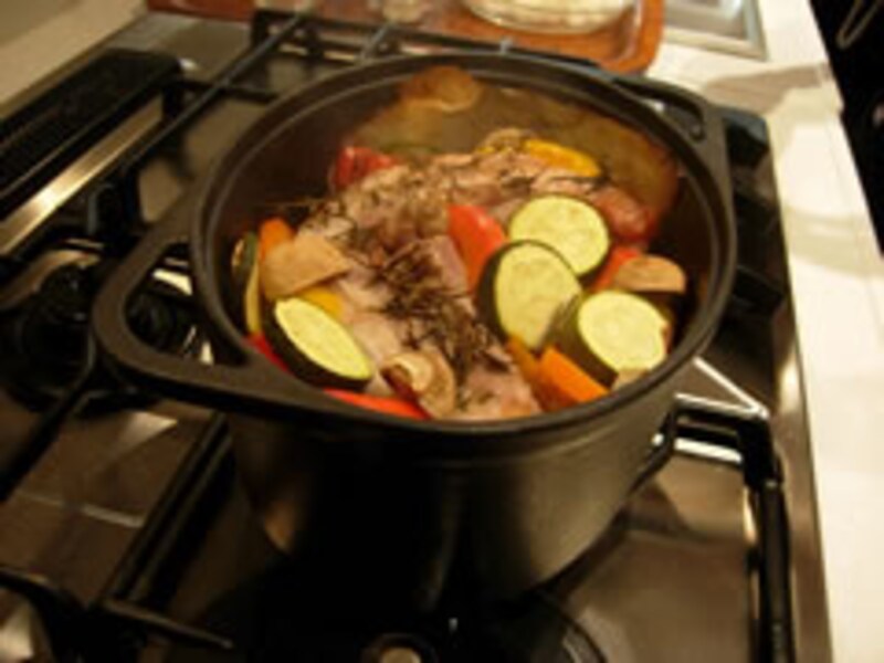 ダッチオーブンでつくったローストポーク。ダッチオーブンはアウトドアクッキングの基本の道具ですが、この鍋を魚焼きグリルを使って使えるようにした発想は画期的だ。ただ容量が少し小ぶりのため+do専用のダッチオーブンでは物足りないというユーザーは必ず出るだろう。むしろ、20分程度の加熱と同じ程度の蒸らし時間で手軽にオーブン料理や無水料理が楽しめる「省エネ調理器具」として位置づけるほうが良いと思う。