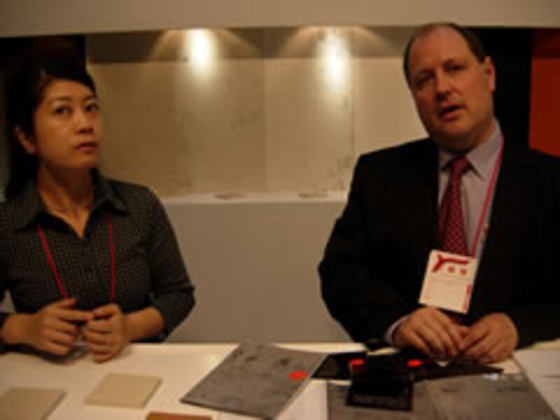 こちらもイタリアメーカーでOKITE(オカイテ) は石英が97%と3%のポリエステル系樹脂で創られた人工大理石の一種。コーリアンなどに比べ耐熱性や耐久性にもすぐれ、アメリカの食品衛生法で定められた安全性も確立されている。写真右はアジア地区マネージャーのIan Smart氏。