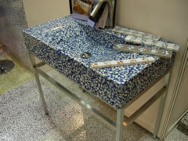イタリアの RIVERSTONEは、大粒の砂利をカラー樹脂で固めて創ったユニークな建材で、床壁の素材や洗面ボウルへの応用など面白い展開のできそうな素材だ。