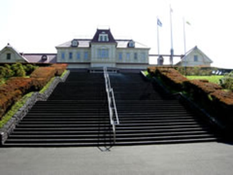 「北海道開拓の村」の正面階段から見上げる。重い大判カメラの道具を一式かついでいるので、こういう階段を見るとがっくりする。幸い右手にはスロープがありそちらから旧札幌停車場の正面入り口に向かう。
