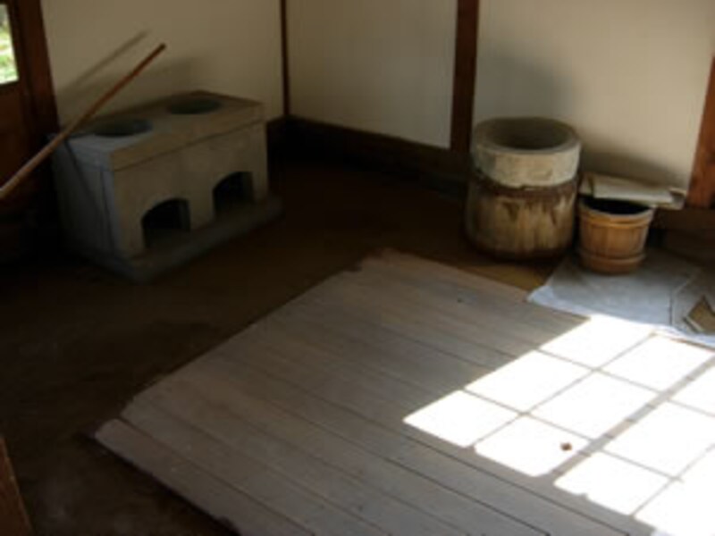 台所に続いて6帖ほどの三和土があり、竈や石臼などが見られる。