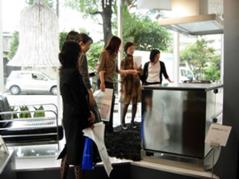 トーヨーキッチンの新製品発表会は、いつもながらとても新鮮な演出が魅力です。BlueNote横の通りに面したショーウィンドウにV-LANDが展示され、路往く人も足を止めてしばらく見入っている。インテリア雑誌の記者達の関心も高くこれから出版される雑誌での評価も楽しみだ。