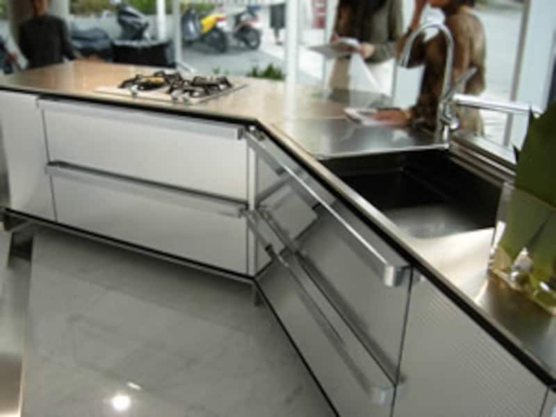 V-LANDのキッチン側デザインは、大きなグリップハンドルが印象的。一本一本ステンレスの無垢材を加工して作っている。少し男性的でゴツ過ぎるという評価もあるが、信頼感のあるがっちりした造形は職人技でしかできない点で他社がなかなか手を出せないジャンルと言えよう。