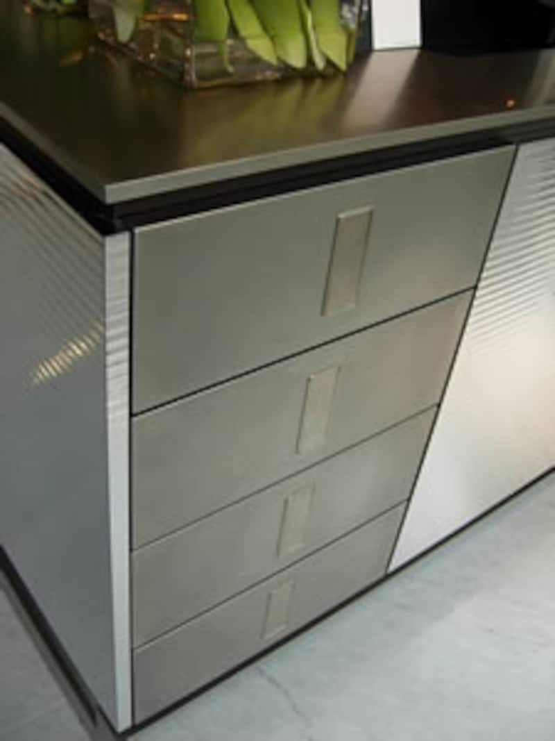 グリップハンドルが邪魔になる左右の引出しは、埋め込み式のハンドルを採用している。
