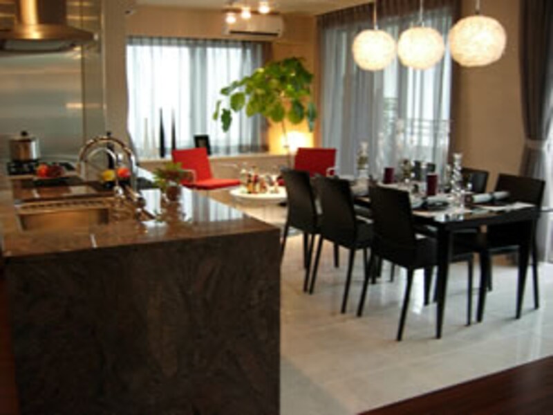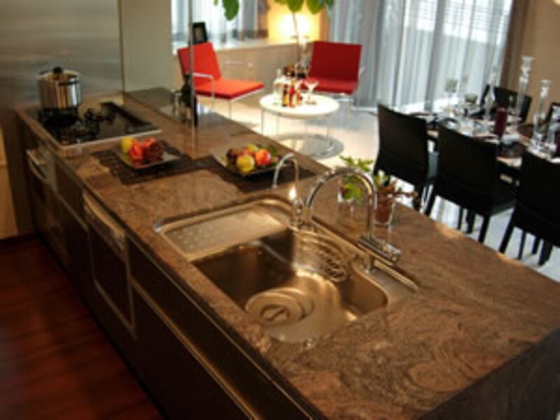 オプション仕様の天然大理石のカウンターと、イタリアンダークオークのキャビネットがラグジュアリーなインテリアを演出する。このペニンシュラーカウンターの外形寸法は間口幅2,900mm、奥行き950mm、ワークトップ高さ850mm。
