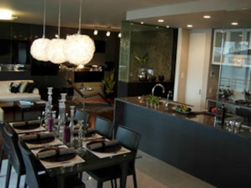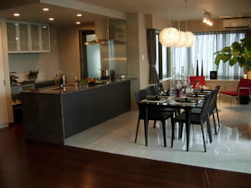 キッチンとの間にはクラッシュガラスを使ったパーティションがあり、オーディオリビングルームからの直接の目線を防いでいる。