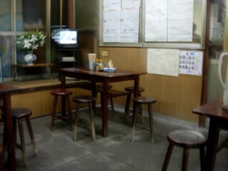 駅前食堂のインテリア!!なんと言うレトロな店内!何十年使われてきたのかしっかりと床に脚をつけているデザインは感動もの。これだけしっかり歴史を刻んできた家具デザインは、今の東京では浅草方面の下町にでも行かなければまず見られない。