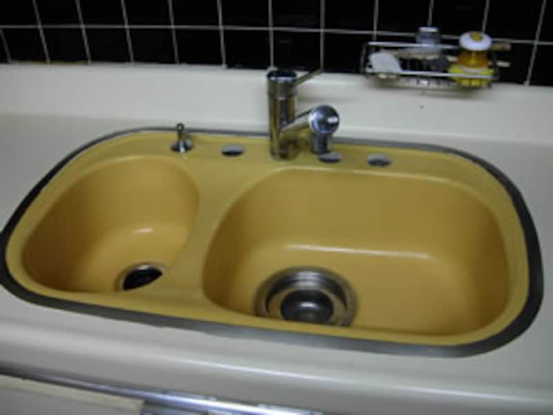 我が家で現役として活躍中の伊奈製陶(現・INAX)の鋳物ホーローシンクは、もう25年以上も使っていますがこんな状態です。実際はシンクマットを使っていますが、ほとんどどこも傷んでいないといえるでしょう。数ヶ月に一度はドメストで簡単に染み付いた汚れを落としています。