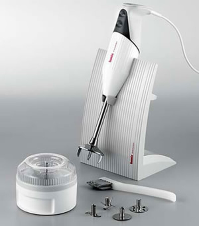もっと手軽にコンパクトに食材加工ができるように考案された道具が「 バーミックス」で有名なスティックミキサーです。「バーミックス」は5種類のアタッチメントの替刃で、つぶす・すりつぶす・混ぜる・泡立てる・砕く・刻む.....と、料理に必要なさまざまな機能を1台でこなしてくれます。鍋に入れたまま煮たカボチャなどの野菜を「バーミックス」でつぶせば、裏ごしをしないで鍋の中でそのまま超簡単にパンプキンスープなどが作れます。