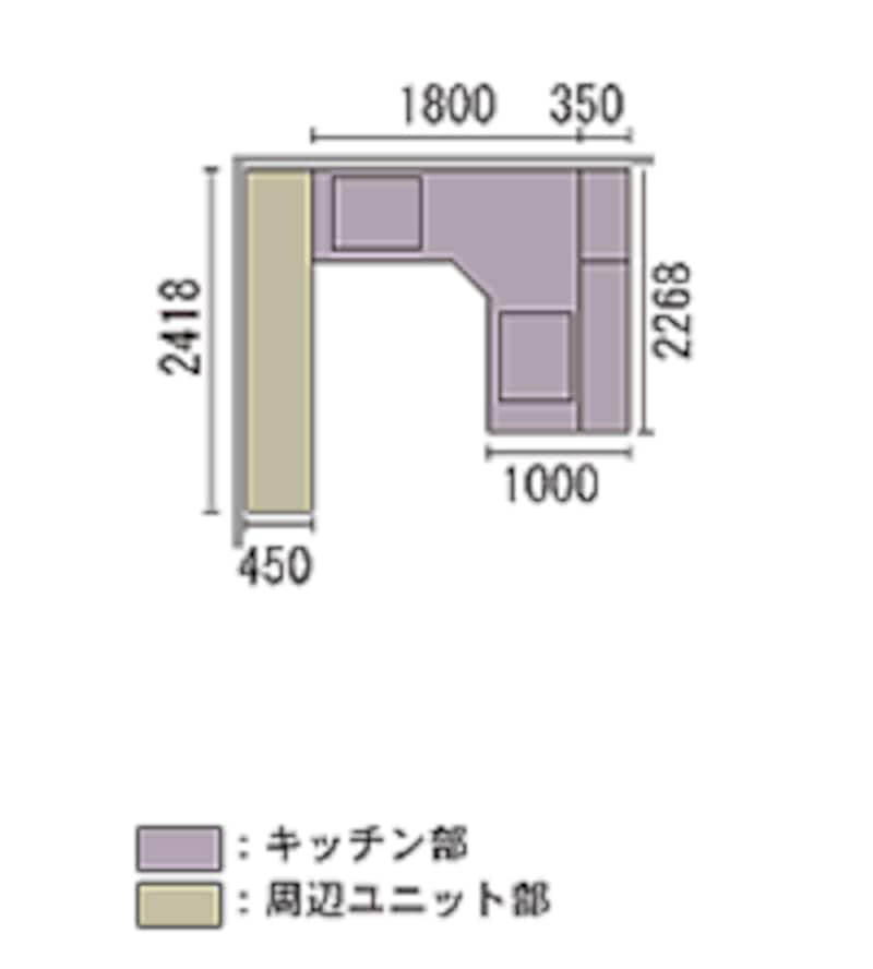 A型プランの寸法は、今回発表の特徴でもあるコーナーウィングキャビネットを取り付ける壁があれば、この図よりコンパクトな1,800×1,800で納まりますが、写真のようなオープンスタイルの場合はハイ対面カウンターのユニットが必要になります。