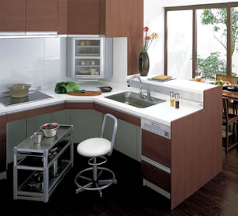 ワークトップのコーナー部に特徴を持たせ、A字型にすることによって調理作業の大幅な効率化を図り、日本のキッチン空間に納まりやすいコンパクトで、ユニバーサルデザイン指向の高いキッチンが新登場です。