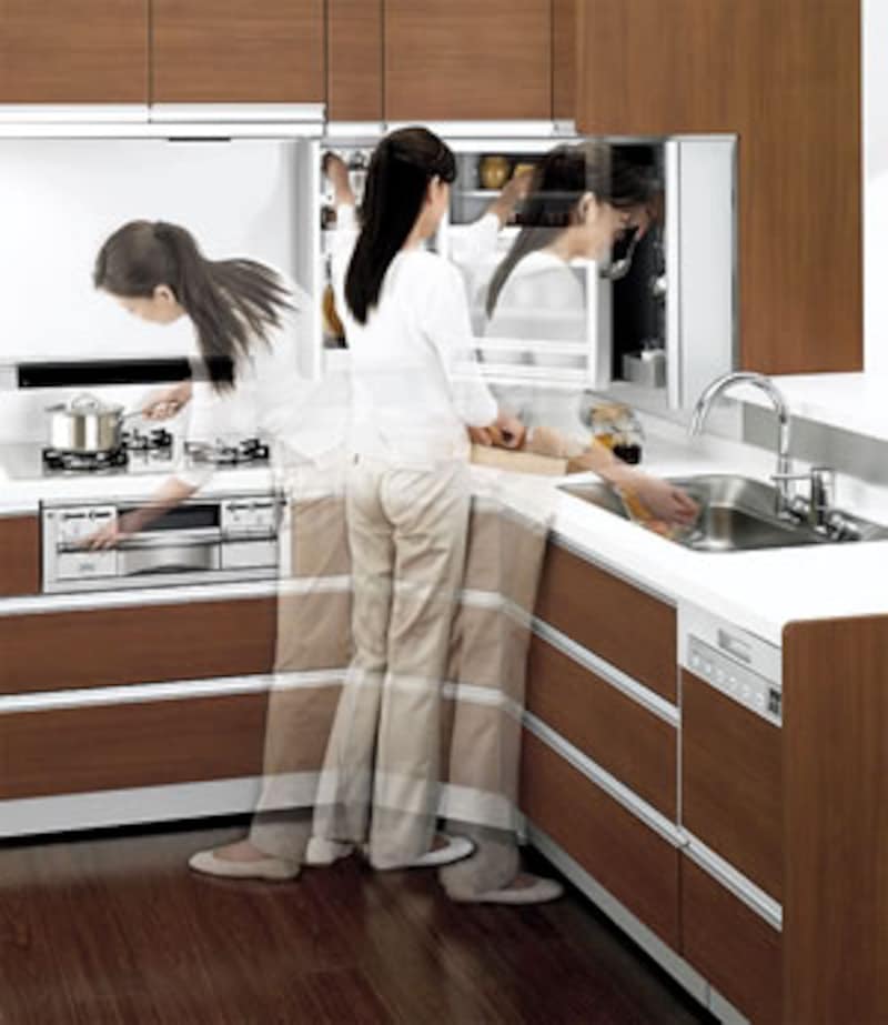 茅ヶ崎にできたUD研究所での生活シーン検証や、キッチン作業の様々な動作研究の施設を充実させてきたTOTOならではの成果が随所に見られる。
