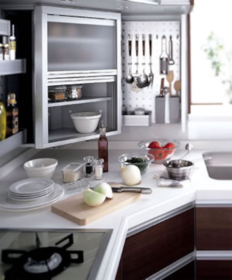 従来デッドスペースになりがちだったコーナーのアイレベル部に収納ユニットを配置することによって手近なところに使用頻度の高い調理道具や調理用具、調味料などを収納することができ、また調理作業中にも頭が当たって邪魔にならない空間を生み出すことができる。
