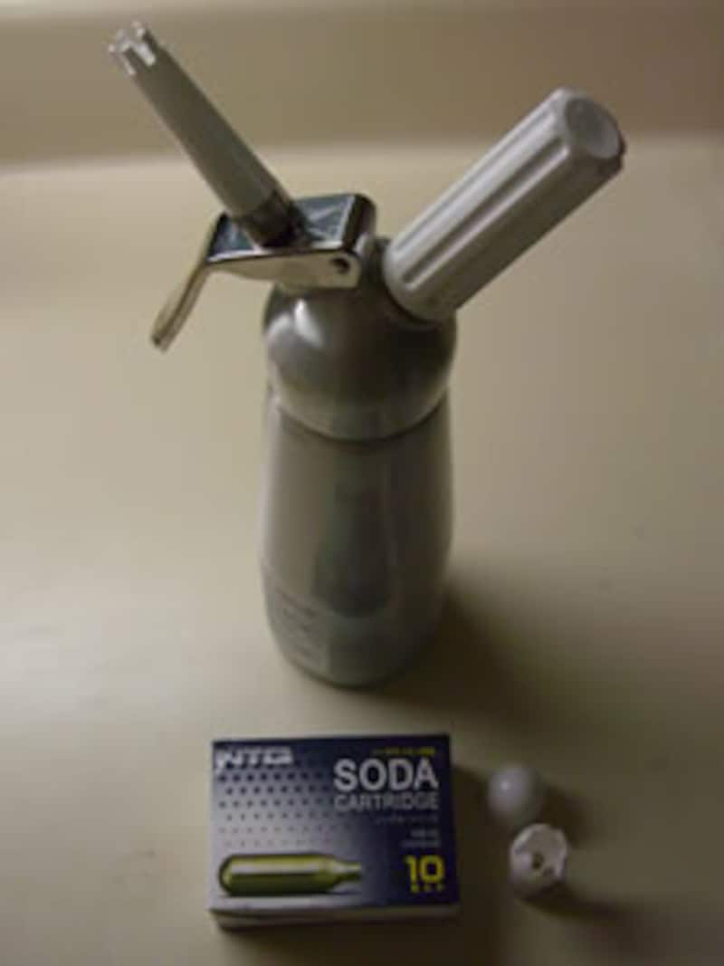 ところが、亜酸化窒素ガスの取り扱いには「危険物取扱者」の資格が必要なのと、大型ボンベでしか供給されていないため、一般家庭で使えるのはこの炭酸ガスカートリッジボンベ方式となります。