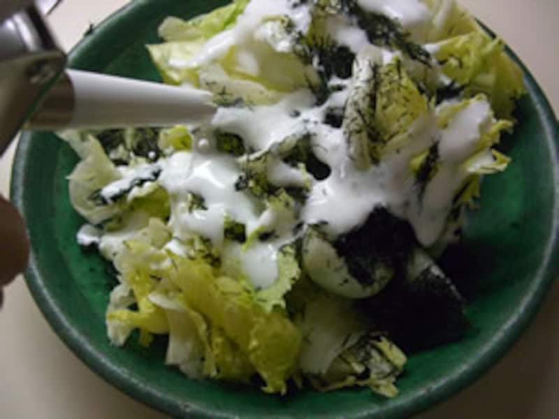 レタスと海藻のサラダにたっぷりのヨーグルトムースをかけてみました。