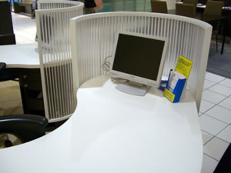ユニークなフォルムのコンサルティングテーブルには、パソコンが組込まれCAD画面を見ながら対話を重ね、効果的なプレゼンテーションが可能な装備を充実させている。