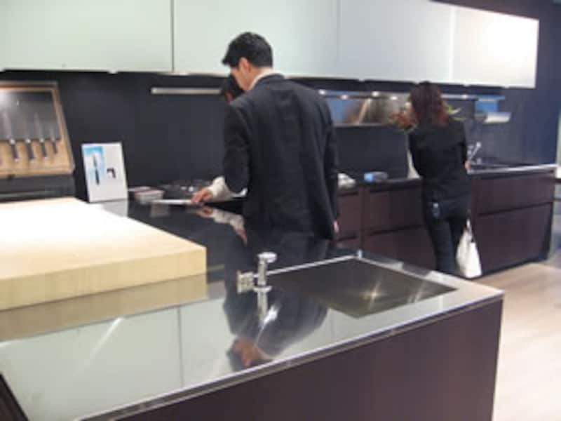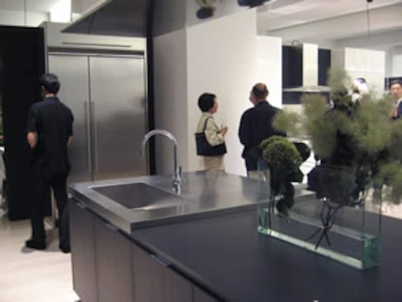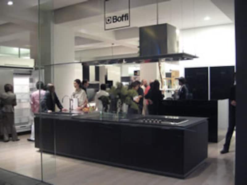 Boffi のキッチン展示は合計で4セット。担当マネージャーの説明ではBoffi本社からこれ以上展示セットを増やさないこと、使うデザインはブラック&ホワイトとステンレスとのコンビネーションに限定するという指示が明確に提示されたと言う。一般的なキッチンショールームと比較すると余裕ある展示スペースが心地良い。