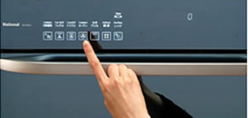 このタッチスイッチは「ネクストサイン機能」を搭載し、まず7つのアイコンの中から「オーブンボタン」を押すと右側に順に、時間設定ボタンが点灯し時間設定、次に温度設定ボタンが点灯して温度設定、最後にスタートボタンを押せばあとは時間がくるまで他の調理作業を続けられるという簡単操作のオーブンレンジです。